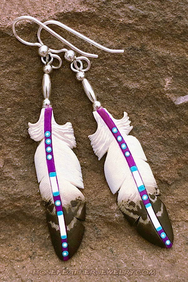 Native American Style Feathers carved in bone and decorated in traditional ceremonial styles. Hand carved bone to less than four thousandths of an inch in detail and hand painted with up to ten separate custom mixed colors. Each pair comes on a card with the birds name in a gift box with care instructions included. Below are examples of necklace choices.